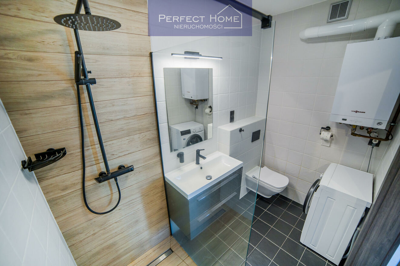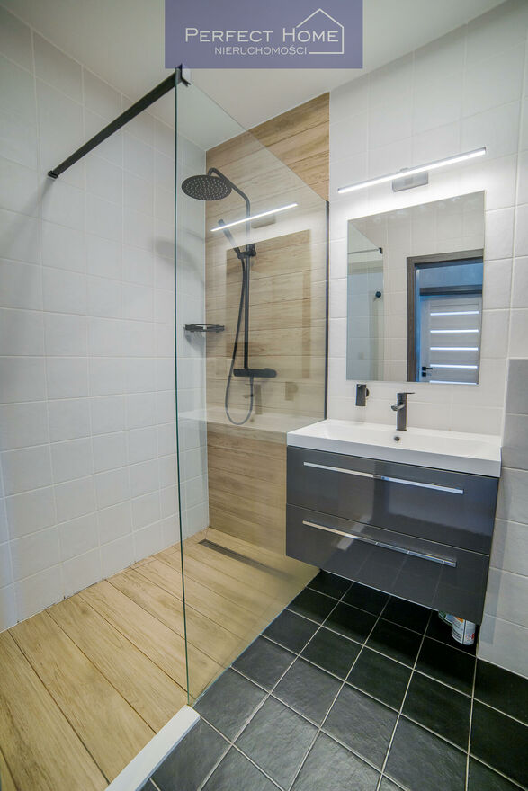 W mieszkaniu jest łazienka z kabiną prysznicową walk in.